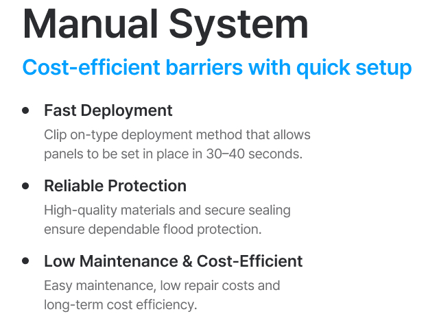 For manual flood barriers, installation time depends on the site scale and conditions.
